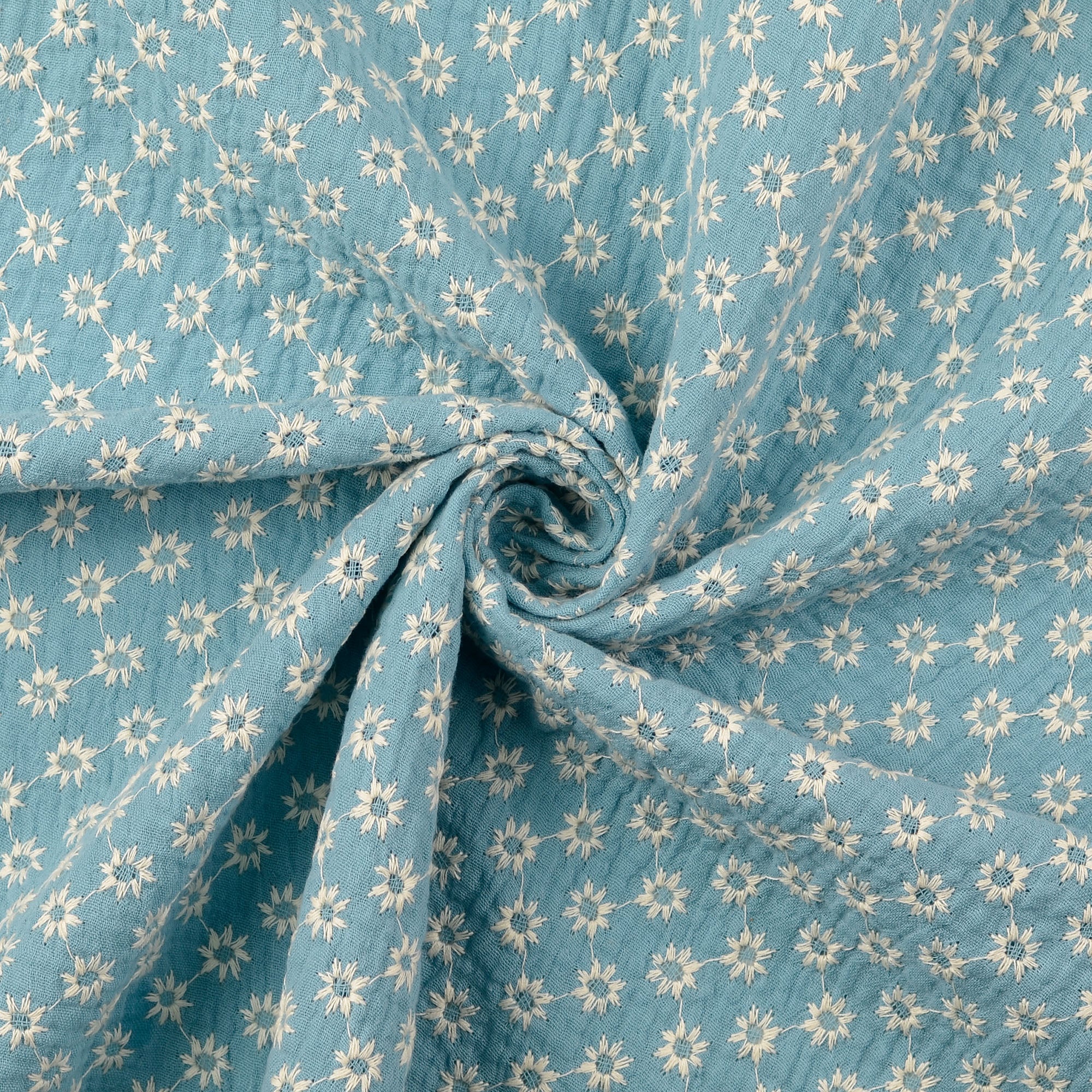 This turquoise muslin flowers fabric (art.nr. 211871.3030) It has a width of 143 cm and weight of 170 g/m2.
